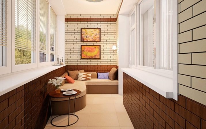 Fotografie ukazuje jednu z optimálních možností designu pro balkonový prostor. Designéři byli jasně inspirováni myšlenkou kontrastu tmavých a světlých prvků místnosti. Rohový nábytek a elegantní žaluzie zcela řeší konstrukční problémy.