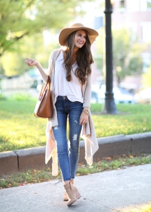 Neméně zajímavý je obrázek složený ze zvířecích kalhot, volné košile a semišové kotníkové boty bez výzdoby.