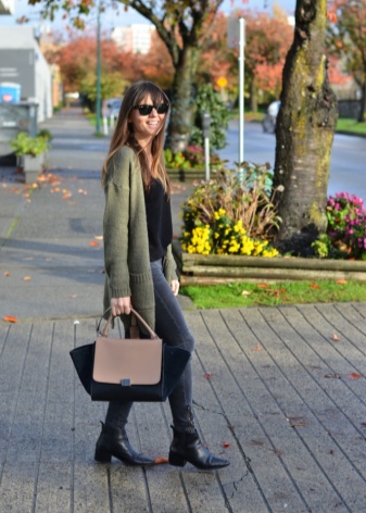 Trendové podpatky s černým čtvercem budou dobře fungovat s kalhotami nebo džínami různých textur. Dobrou volbou pro doplnění vzhledu jsou modré džíny, černý tílko, bažinový svetr a černé špičaté holínky.