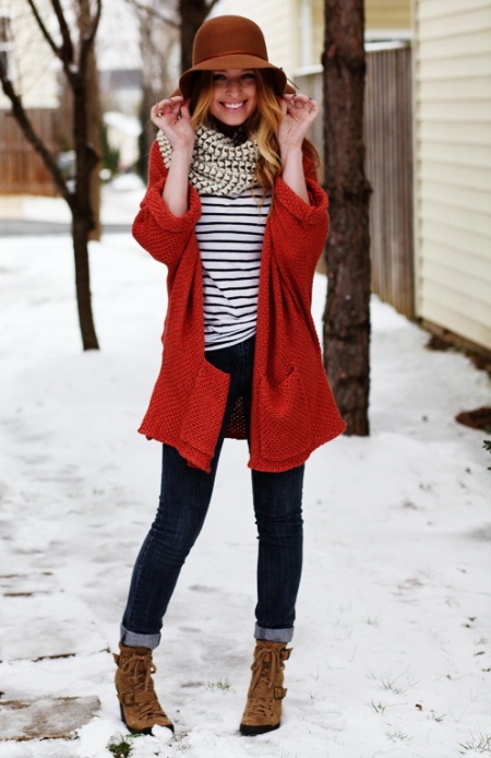 Urban podzimní příležitostné se může ukázat jako světlé, pokud si obléknete červený svetr s hlubokými kapsami Scarf Snood, čepice a kotníkové boty s nízkým podpatkem s tkaničkami dodají luk dynamiku a sexualitu.