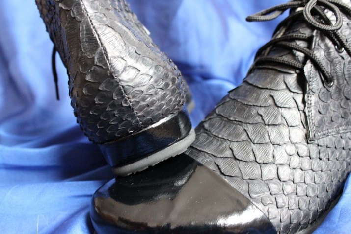 Tištěné modely pod pythonovou kůží jsou mimořádné. V takových konstrukcích je dvojicí kladen důraz na materiál: dekorem výrobků je lakovaná kůže, šumivá saténová a malachitová textilní potisk kotníku.