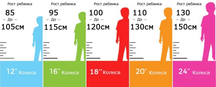 Pokud je výška malého závodníka 110-125 cm, jsou pro něj vhodné modely se 16-palcovými koly s rámem 9 palců a pro děti s výškou 115-135 cm je lepší zvolit varianty s koly 20 palců. Pro růst 125 až 150 cm bude vhodné kolo s 24palcovými koly a rámem 13 palců. Kromě toho existují dospívající vzorky s 26palcovými koly, ale s nízkým rámem (14 palců), určené pro jezdce s výškou 135 - 160 cm.