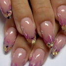 Ve francouzské technice budou vypadat obzvláště krásně. Tento design bude prostupen elegancí, ale pro expresivitu je lepší změkčit akcentové nehty stručnějším designem povlaku. Pro základnu byste měli vybrat obyčejný pastelový nebo přechodový. Není možné zkreslit vzor, a proto by velikost květů měla odpovídat nehtům. Oříznutí sušených květin je nežádoucí - to kazí složení.