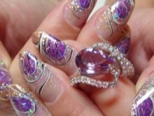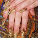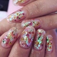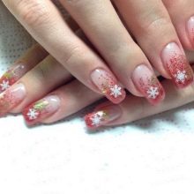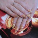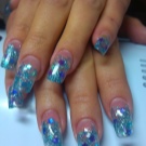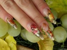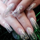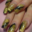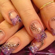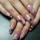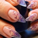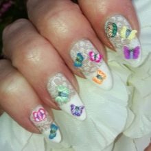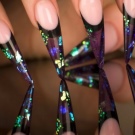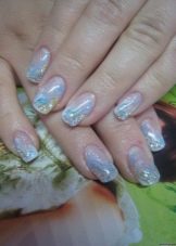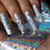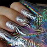 Vypadá krásně navržený pod jantarovou francouzskou manikúru. Udělejte to pomocí ostrovní fólie na manikúru. Kromě toho se akrylový prášek na manikúru používá k ozdobení nehtů a jejich zdobení povrchem rozšířeného nehtu základní vrstvou. Fólie samotná může být jemně nasekaná a nanášena podle návrhu na požadovaná místa na nehtové desce. Po dekoraci je hřebík utěsněn modelovacím materiálem.