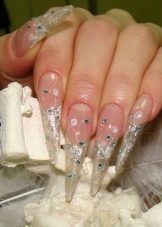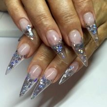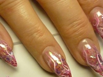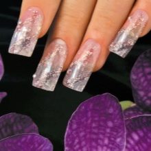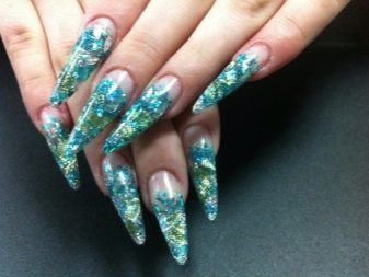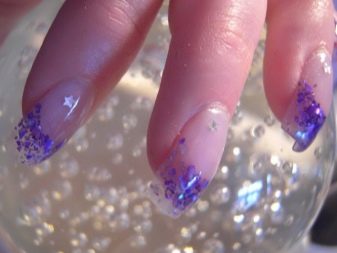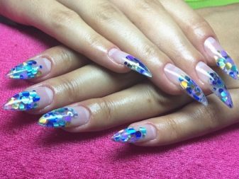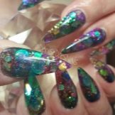 Šumivé flitry jsou jedním z nejlepších řešení pro večerní design. Jsou ideální pro zdobení nehtů různých délek a tvarů. Třpytky mohou být smíchány, používat různé odstíny, a tím vytvářet efekt ombre s hladkým protahováním. Lze použít libovolné barvy, ale tóny pastelové skupiny harmonicky zapadají do ženského luku. Chcete-li vytvořit obrázek, můžete použít štětec, jiskry mohou zdůraznit designové prvky.