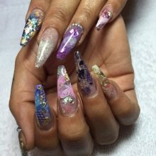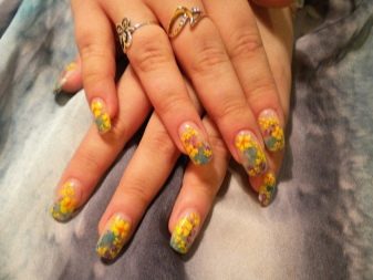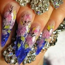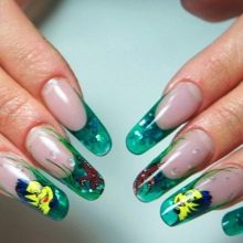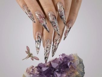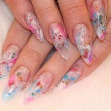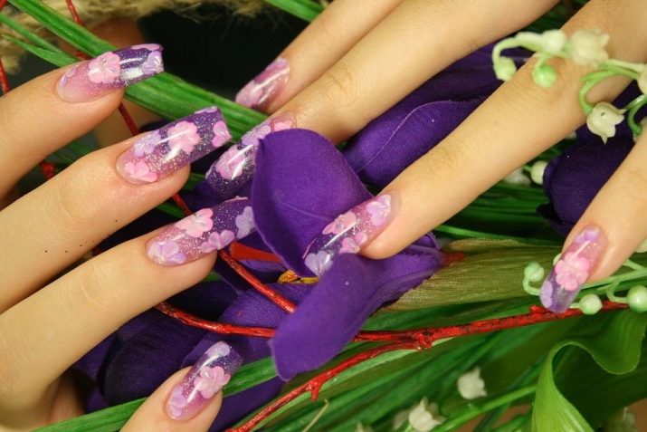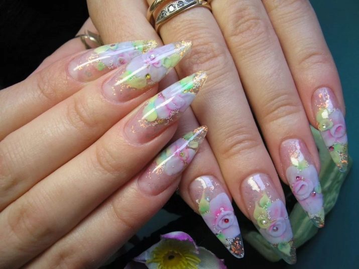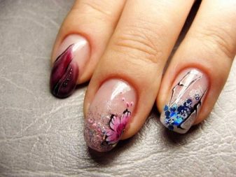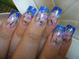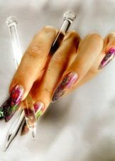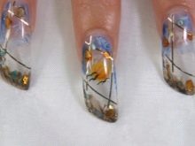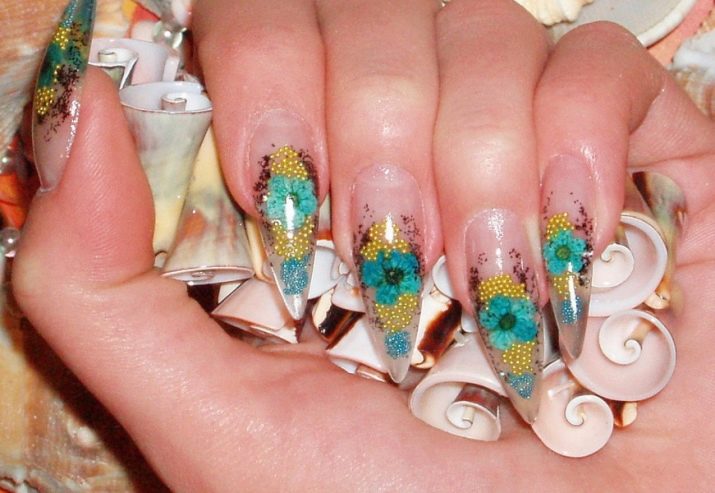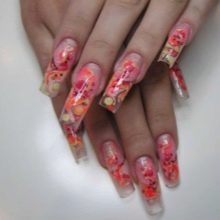 Například jedním z nejlepších témat akváriové technologie je použití květinových motivů. Skutečně, nehty s objemnými barvami vypadají krásně a jemně, tento design dýchá žensky. Pro harmoničtější design by však délka hřebíků měla mít tendenci se prodlužovat.Jako základ pro výzdobu je lepší nepoužívat obrázky, ale sušené květiny.