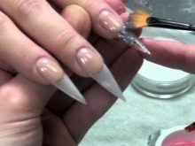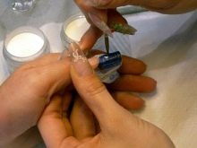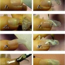 Po dokončení předběžných kroků pokračujte k návrhu hřebíků samotných. K tomu jsou desky po jejich mletí a odmaštění ošetřeny speciálním adhezivním materiálem. Mistr vybere substrát, který je pro něj vhodný, a materiál, který je pro ni nejlepší. To mohou být horní formy, což platí zejména pro krátké a zlomené nehty. Je vhodné s nimi pracovat: mistr zvedne poly-gel, lehce jej rozloží uvnitř hrotů na budoucí základně nehtu a aplikuje ho na přírodní hřebík, pevně ho přitlačí. V případě potřeby formulář opravte. S polygelem je snazší pracovat, protože neprotéká, ale v případě potřeby je obtížnější ho odříznout.