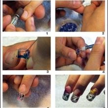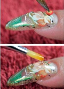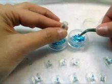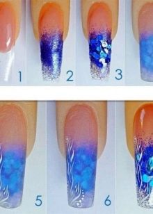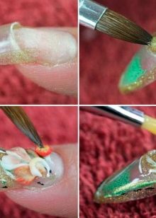 Neméně důležitým krokem v akváriové manikuře je označení přibližného vzoru. Tato položka je zvláště důležitá, protože ukáže, jak krásný bude vybraný design vypadat na nehtech. Kromě toho vám montáž umožňuje vidět význam výzdoby pro konkrétní styl a obraz ženy. V této fázi mistr zváží, zda se budou kombinovat fólie a vzor, kamínky nebo zda je lepší použít korálky, vývary, zlatá vlákna, slída nebo dokonce mramorové třísky.