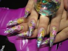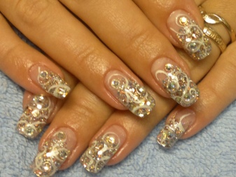Při provádění volumetrického návrhu je třeba vzít v úvahu jeho houževnatost: všechno nalepené na gelu nebo akrylu přilne k něčemu tak či onak. Kromě toho nesmíme zapomenout, že dodatečný dekor zhušťuje celkovou vrstvu nehtu spolu s povlaky. Často to vypadá ošklivě, a proto, než zavěsíte něco jiného na trojrozměrný trojrozměrný design, měli byste zvážit, jak je to vhodné a zda je vůbec nutné.