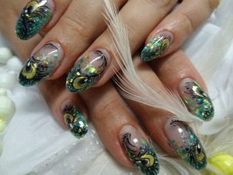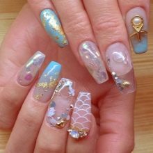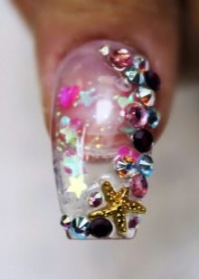 Lze použít nejen běžný dekorativní materiál, který se obvykle používá při práci s hybridními laky. Aqua-design je kreativnější, a proto si můžete i při zdobení nehtů ozdobit drobné peří, barevný písek, mušle, krajky. Lze použít i kousky pravidelných novin, sušených květin, flitrů, fólií a dokonce i vody.Mnoho žen sní o manikúru s účinkem akvária, protože vám umožní vyniknout z davu a cítit se zvláštně.