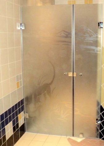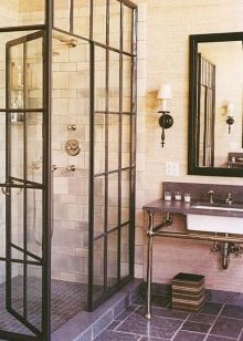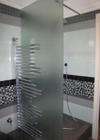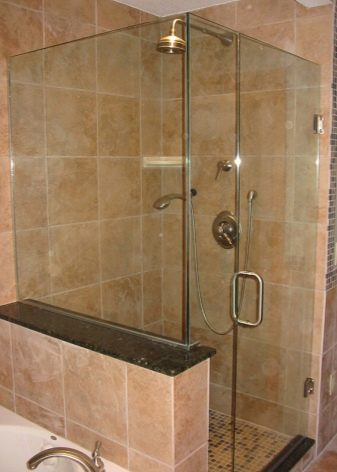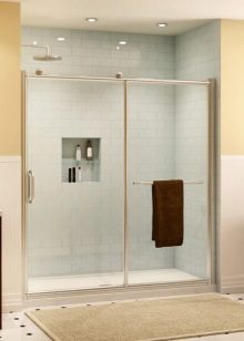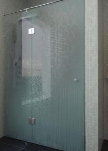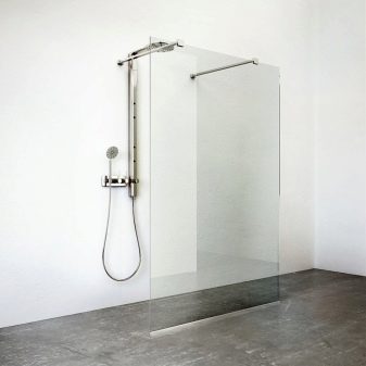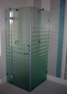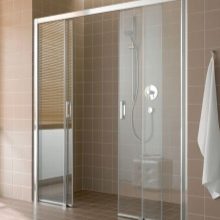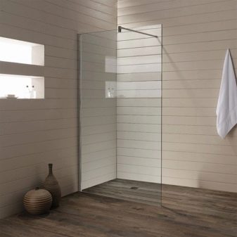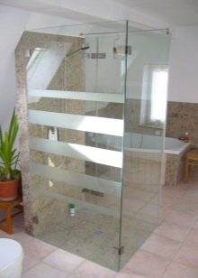- Sklo. Jsou vyrobeny z tvrzeného skla o tloušťce 4 mm. Tyto stěny jsou vysoce hygienické, odolné proti mechanickému poškození, vzhledu plísní a plísní. Další výhodou skleněných přepážek je snadná údržba. Nevýhodou je poměrně vysoká cena.