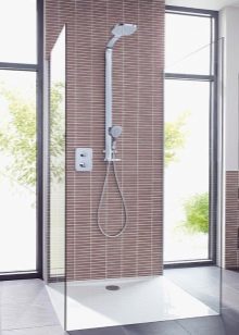- Rohová sprcha v soukromém domě. Ve společné koupelně s koupelnou je místo pro sprchování oploceno nízkou dekorativní hranou, takže prostor v koupelně není zaplaven vodou. K dekoraci povrchu byly použity dvě barvy - bílá a šedá. Barevný přechod by měl být prováděn hladce. Na rozdíl od těchto odstínů lze dát takové světlé prvky, jako jsou různobarevná sklenice, župany a ručníky.