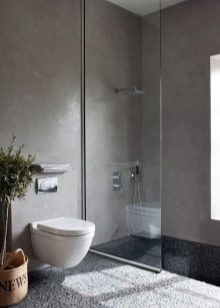 - Minimalismus. Je to vynikající řešení pro vytvoření designu koupelen v bytě, když není dostatek prostoru pro realizaci kreativních nápadů. Při vytváření sprchy bez kabiny je důležité věnovat pozornost skutečnosti, že všechny faucety musí být zabudovány do zdi. Příčky pro stavbu jsou nejlépe vybrány z tvrzeného čirého skla. Hlavní věcí v designu bude osvětlení, nad sprchou ve stropě, nebude bolet instalovat další osvětlení. Podlaha musí být rovná.
