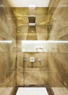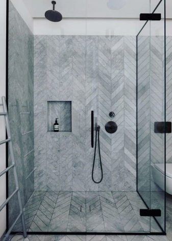Je také důležité to zvážit instalace sprchy bez sprchové kabiny má určité požadavky na zakrytí stěn a podlah. Stěny jsou obvykle zdobeny mozaikou, břidlicí, pískovcem, žula nebo mramorem.