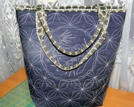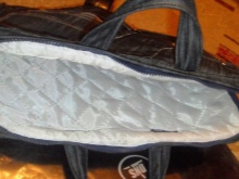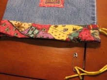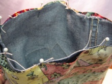 Šijte na podšívku, zatímco džíny části sáčku by měly být otočeny dovnitř ven, podšívka na obličeji. Označte místa upevnění držadel, připevněte je kolíky, stehem.