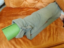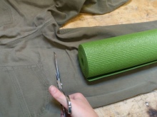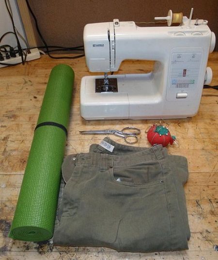 - Odřízněte jednu nohu z džíny. Připojte k ní svinutý koberec, proveďte měření (kryt by měl být o několik cm delší než koberec). Odřízněte veškerý přebytek.