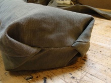 - Složte nohu, jak je znázorněno na fotografii, sešijte okraj - to je spodní část budoucího obalu.