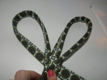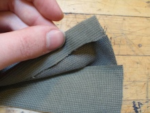 - Část pásu s přezkou by měla být také šita do středu, ale ze spodní strany vaku (viz foto). V oblasti tohoto kusu pásu našijte druhou smyčku.