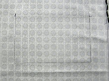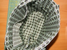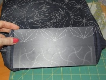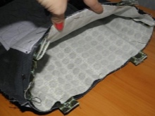 Zesílíme dno tenkou plastovou nebo silnou lepenkou, proto jsme ořízli obdélník na velikost výsledného dna. Dále zašijte na dno obal jakékoli měkké textilie, jak je znázorněno na fotografii. Na rohy dna sáčku našijte plastový kryt.