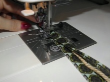 - Vytvořte díru na nejdelší části popruhu pomocí šňůry. Podívejte se pozorně na fotografii a podobně ušijte tuto část popruhu do středu budoucí tašky. To by mělo být provedeno ručně pomocí jehly a nitě. Potom vezměte úsek 3 cm dlouhý, vytvořte pomocí otvorů dva otvory podél okrajů a zašijte knoflíkovou dírku, jak je znázorněno na fotografii.
