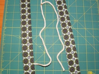 Rukojeti pro tašku budou také vyrobeny z podšívky. Pro ně musíte vystřihnout 2 obdélníky o rozměrech 45x10 cm, složit je, jak je znázorněno na fotografii, a vyžehlit je. Rovněž udělejte dva výřezy prádelní šňůry o délce 40 cm a lehce roztavte její konce lehčím nebo zápalekým zápalekem. Vložte lano do středu páky držadla a přišijte jej k okraji. Protože je lano kratší než samotné držadla, musí být zasunuto tak, aby na obou stranách zůstaly rovnoměrné segmenty (tyto části držadel budou přišity do vaku).