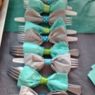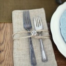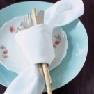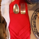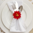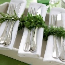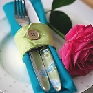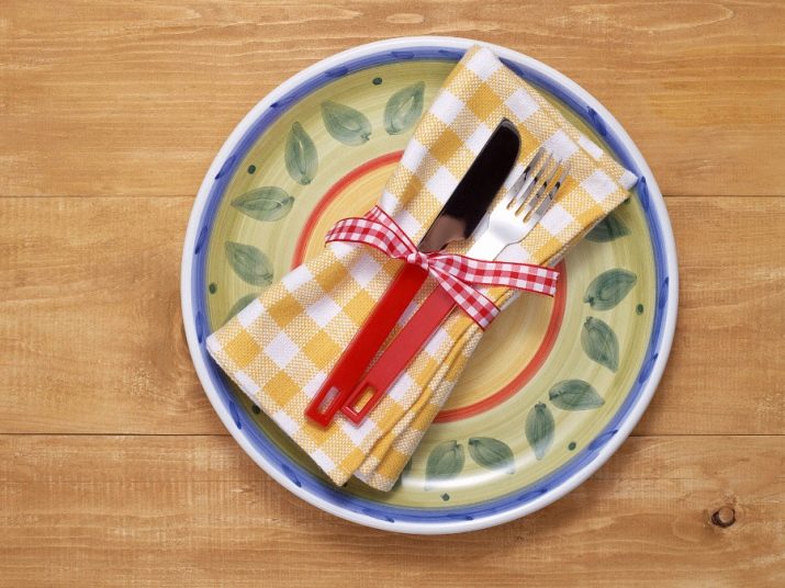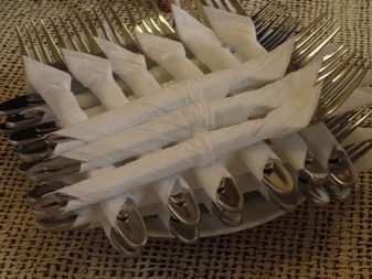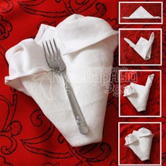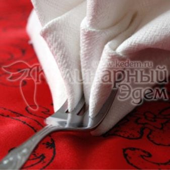 Skvěle zdobená vidlička umožní správně umístěné látkové ubrousky. Nejprve je třeba ji složit diagonálně, pak ohnout její spodní hranu 2 cm a udělat několik záhybů, které je třeba protáhnout stroužky vidlice. Poté můžete ozdobené příbory položit na talíř nebo blízko něj.