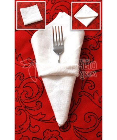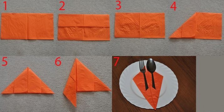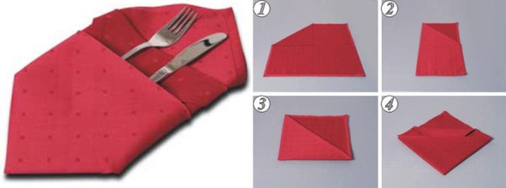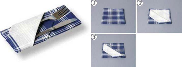 Klasickým řešením pro skládání tkáňových ubrousků je „diagonální sáček“, který externě má co do činění s obálkou. Tato možnost zahrnuje samostatné kapsy pro každý příbor. Ubrousek byste měli rozložit a složit přesně na polovinu, přičemž by to mělo být provedeno svisle a pak také diagonálně. Výsledkem je čtverec, kde musíte ohnout pravý horní roh a poté jej přesunout do levého dolního rohu.