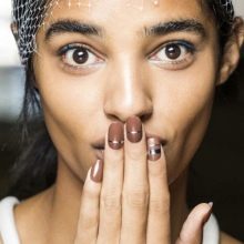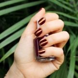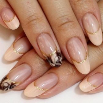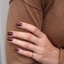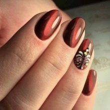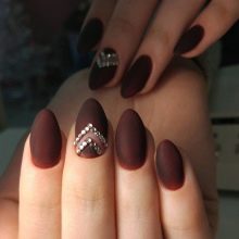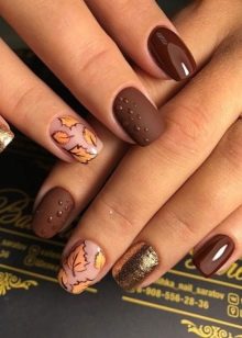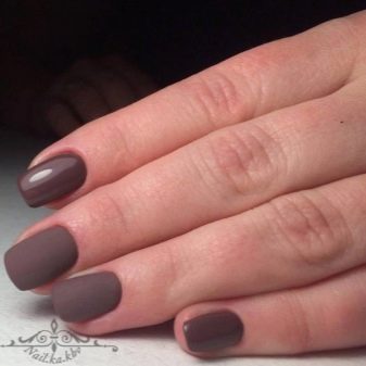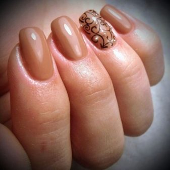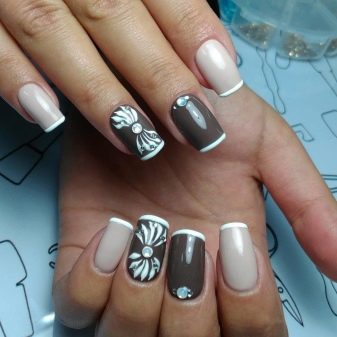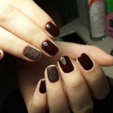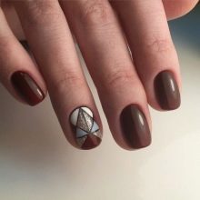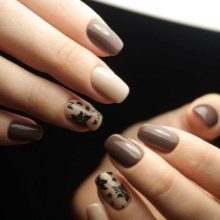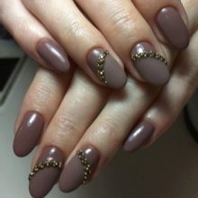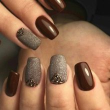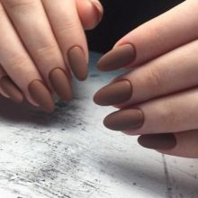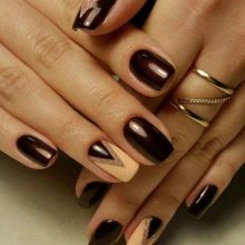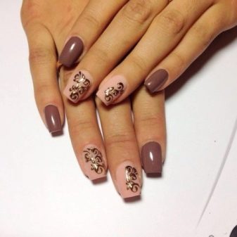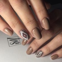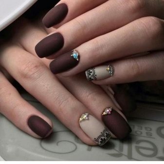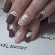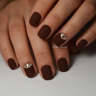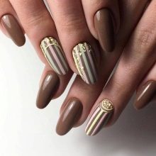 Hnědá manikúra je univerzální pro jakékoli stylistické řešení. Béžová a písek jsou vhodné pro přísný francouzský nebo měsíční design a čokoláda a mandle pro slavnostní. Výhodou barvy je její nezávislá sofistikovanost a snadná kompatibilita s jinými barvami a dekorem.