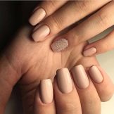 V létě můžete bezpečně kombinovat všechny odstíny této barvy a jasných barev. Béžové pozadí se třpytkami je skvělým řešením pro manikúru pro moře.