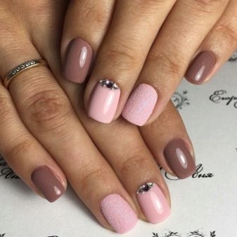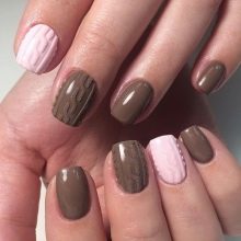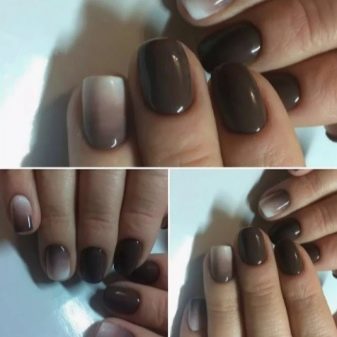 Jasnější manikúra může kombinovat hnědé a růžové laky. Různé palety vám umožní vytvořit zajímavý design na nehty bez použití dalších barev. Při vytváření přechodu se často používají odstíny hnědé. Hladký přechod ze světla na tmavší lze provést okamžitě na všech nehtech nebo zvýraznit jeden prst tímto řešením.