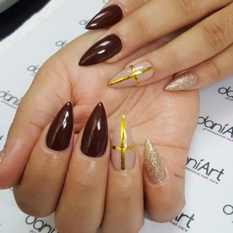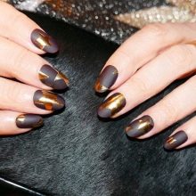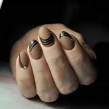 Časté používání hnědých tónů v umění nailních nehtů je vysvětleno vynikající kombinací barev ušlechtilých kovů: zlata a stříbra.