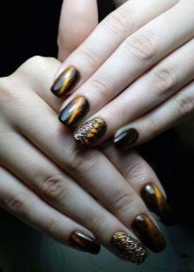 Pomocí speciálních laků hnědého gelu a magnetu můžete vytvořit efekt „kočičího oka“ na nehty. Takové nehty se třpytí krásně ve světle a vypadají luxusně.