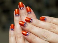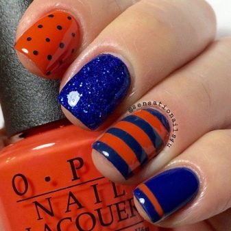 - Všechny odstíny oranžové se dobře prolínají s modrou paletou. Je však třeba si uvědomit, že taková manikúra je celkem jasná, a proto vyžaduje dokonalé nehty.