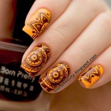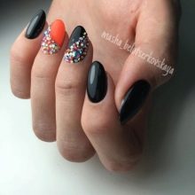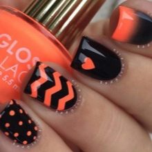 - Klasická kombinace oranžových tónů je považována za černobílou. Vypadá dobře na nehty jakéhokoli tvaru a délky a také umožňuje vytvořit libovolnou kompozici v závislosti na účelu. Chcete-li se zaměřit na nehty, můžete vytvořit design v kombinaci oranžové a černé, zatímco mohou být stejným číslem na hřebíku nebo převahou pouze jedné barvy.