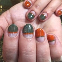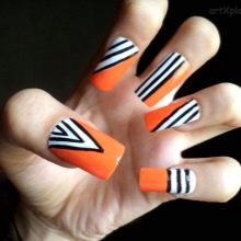 - Kombinace barev. Obvykle je černá a bílá. Na jasně oranžovém pozadí můžete umístit proužky těchto barev. Mohou být jak vertikální, tak horizontální. S tímto přístupem můžete stále vizuálně upravovat délku. Oranžová může také sloužit jako doplněk k základní barvě. Mohou zvýraznit jeden hřebík a malovat ho úplně jasnou barvou. Ombre v kombinaci oranžové barvy vypadá jasně, v chladném ročním období bude moci vytvořit příjemnou náladu.