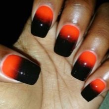 - Kombinace červené a jasně oranžové je nejpřijatelnější při vytváření přechodu. Takový plynulý přechod na nehty nevytvoří vulgární obraz. A v létě se stane nezbytným doplňkem šatníku.