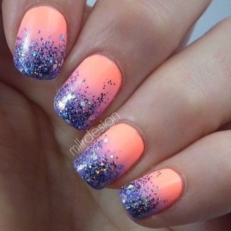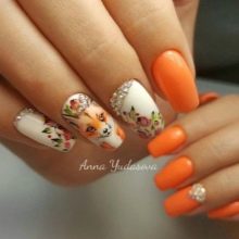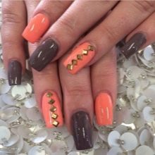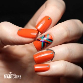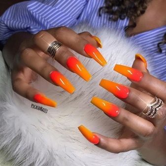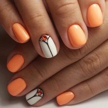 Bez ohledu na zvolenou kombinaci je třeba si uvědomit, že oranžový odstín je docela jasný prveknení tedy nutné jej přetížit. Živé doplňkové barvy jsou přijatelné, ale pouze jako detaily. Obecně taková manikúra vyžaduje plynulé přechody z jedné barvy do druhé bez ostrých kontrastů.