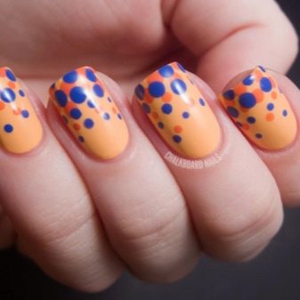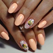 - Kresby. V tomto případě může oranžová působit jako základ i jako přídavek. Jako základ takového laku můžete použít volumetrické kresby rostlinného nebo zvířecího motivu. A také oranžové ozdoby budou vypadat dobře na kontrastním pozadí. Design s geometrickými liniemi je stále na vrcholu popularity díky své jednoduchosti a stručnosti. Kapky, hrášek, květiny zapadnou dobře do designu s broskevovým gelem. Tento odstín je považován za ideální základ pro použití výkresů.