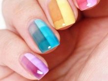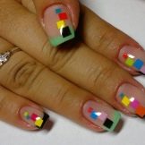 Geometrická transparentní manikúra je další myšlenka používající průsvitný gelový lak. K jeho implementaci budete potřebovat několik vícebarevných gelových laků, základní průsvitný lak a tenkou lepicí pásku.