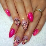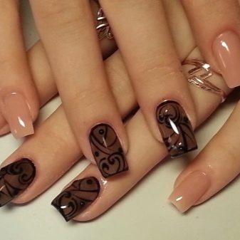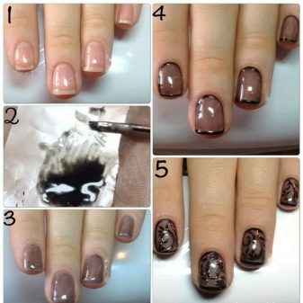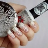 Světlé, neobvyklé vzory jsou obzvláště krásně vyhlazeny díky průhledné podložcepoložený hlavní vrstvou na nehtovou desku. Výkresy se provádějí tenkým štětcem za použití akrylových barev. Jejich hustotu a odstín lze změnit smícháním různých barev.
