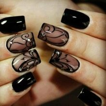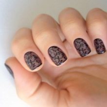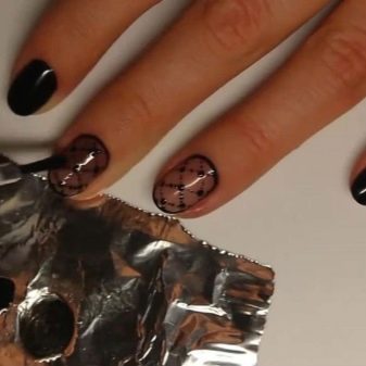 Použití průsvitného černého gelového laku vám umožní vytvořit povlak, který se také nazývá „závoj“. Jedná se o velmi sofistikovaný a elegantní design. Má vzor opakující pletivo z nylonových punčocháčů nebo závojů.