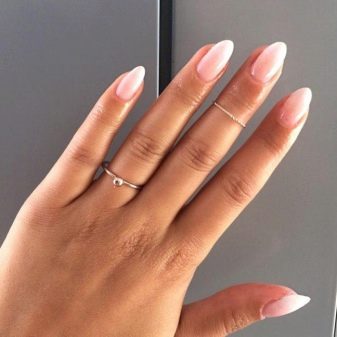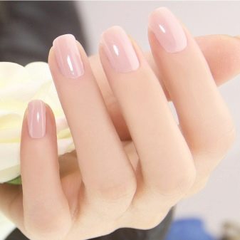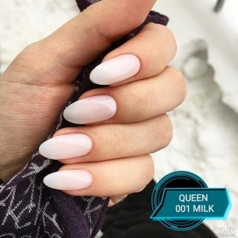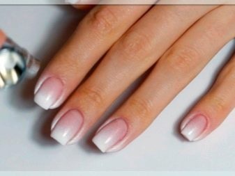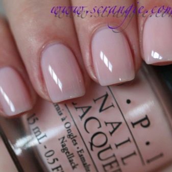 Průsvitný gelový lesk nahých odstínů umožňuje klasickou manikúru a při stavbě vizuálně prodloužte nehtovou desku. Tato konstrukce má své vlastní vlastnosti: nátěr by měl být kladen rovnoměrně se zachováním tónu na nehtové desce bez plešatých skvrn a pruhů. Hlavním tajemstvím aplikace je odstranění lepivé vrstvy základní vrstvy, se kterou je hřeb vyrovnán. Poté bude úsek barev bezchybný.