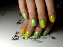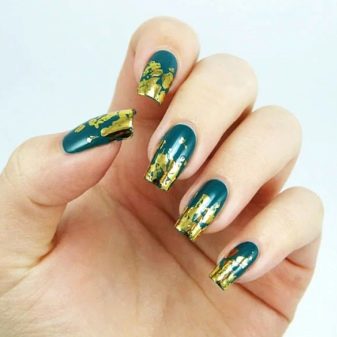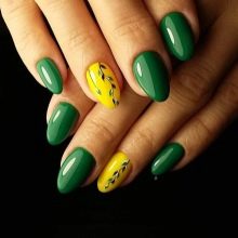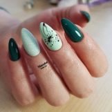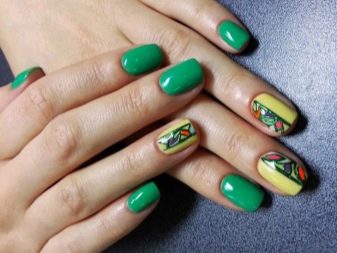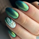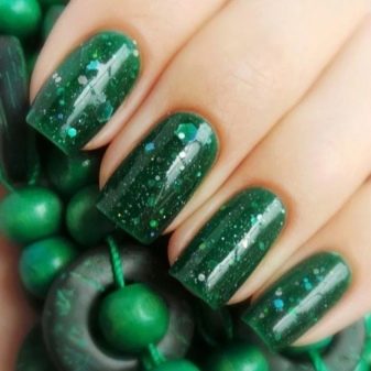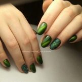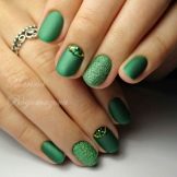 Tato barva často vůbec nevydrží soupeření s šumivým dekorem, protože lesk může zjednodušit ušlechtilost textury vybraného laku. Dobře se však hodí k různým práškovým materiálům, díky nimž můžete design vylepšit.Zelený gelový lak je výrazný, což lze vyjádřit způsobem provedení návrhu. Používají ho mistři servisu nehtů, spoléhají na texturu a expresivitu a ukazují svůj tvůrčí potenciál.