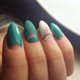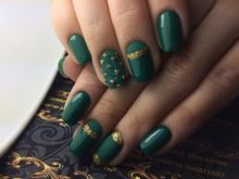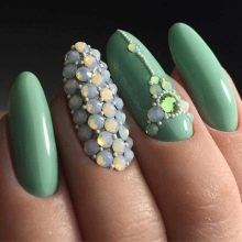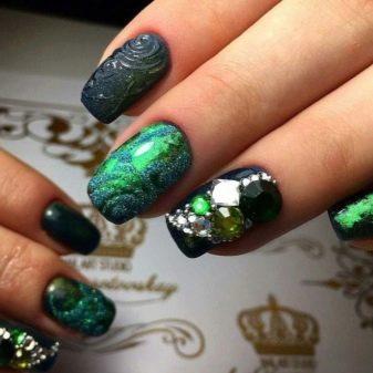 - Použití tekutých kamenů je megaactual, vykládané nehty s krystaly Swarovski jsou v módě. Je však důležité to přehánět množstvím dekorů, protože stejné kamínky jsou způsoby, jak zjednodušit design na pozadí vznešené zelené základny. Proto by uspořádání šumivých prvků mělo být bodové a dávkované. Krystaly se netvoří na všech prstech, budou vypadat lépe se skromným obloukem v oblasti kutikuly, místo pupenů nebo pupenů listů, kapek rosy nebo skromného středu květu.