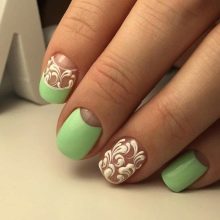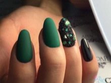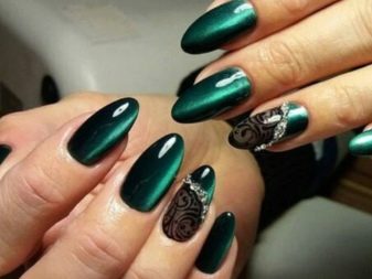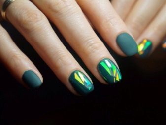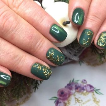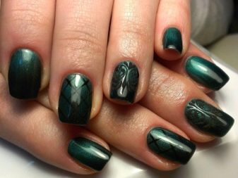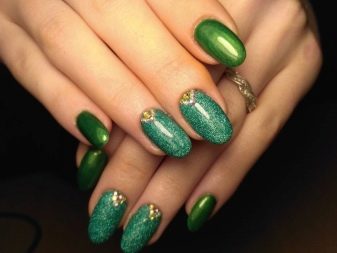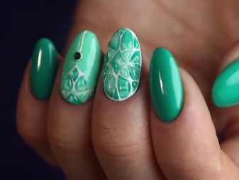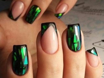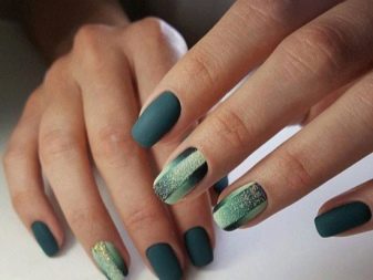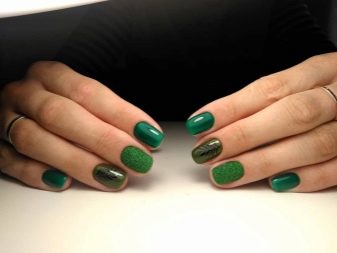 - Zelená barva je vynikající příležitost odhalit možnosti textury. Proto se pro výzdobu akcentů používají jiskry a utěsněné barevnými skleněnými laky, které se nanášejí velmi tenkou vrstvou. Současně je módní zdobit design ohybem. Stejné barvy jsou namalovány kontrastním tónem.