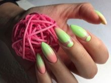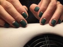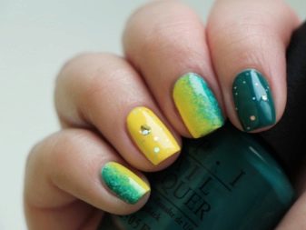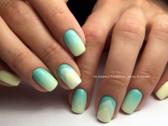 Současně lze na jeden přízvukový hřeb provést efekt ombre ve dvou opačných směrech. Řekněme, že na vrcholu běžné strie můžete nakreslit kontrast svisle, provést plynulý přechod kontrastních odstínů, posypat je práškem. Pokud se vám toto řešení nelíbí, můžete si dokonce udělat ombre s úsekem odstínů od prstu po prst, přičemž si pro každý nehet vyberete související zelené odstíny.