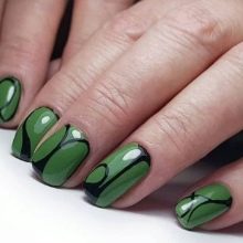 Pokud lze odbarvený nazelenalý odstín nějakým způsobem vstoupit do přísných pravidel oblékání, může se zelená manikúra někdy zdát příliš chytlavá. Proto je nutné přistupovat k výběru designu pečlivě, s přihlédnutím k účelu a stylu oblečení. A je také důležité vzít v úvahu skutečnost, že zelená barva by neměla přesně kopírovat tón hlavního oblečení. Pro větší expresivitu a ušlechtilý kontrast ve světle vypadá lépe v harmonii s příslušenstvím. Navzdory zjevné klidu, ne každý zelený tón v manikuře potěší svou milenku po celou dobu, kdy nosí tento nátěr.