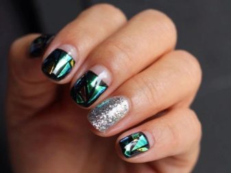 - Co se týče druhého, důraz je kladen na odrůdy „mořská panna“, „květák brouk“ a „polární záře“. Je důležité zvolit závoj s malým a beztížným perletím, takové polyesterové prášky esteticky mění strukturu zeleného gelu. Kromě malé frakce závojů jsou také žádány vločky yuki. Mohou simulovat bundu na dlouhých prodloužených nehtech.
