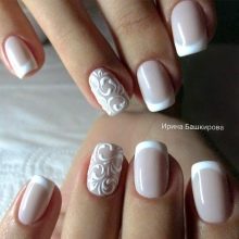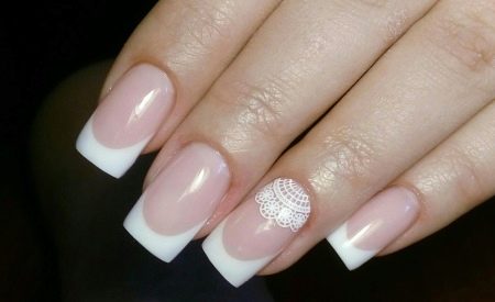 Čtvercový tvar hřebů se hodí pro klasickou bílou nahou bundu. Zvýrazněním jednoho prstu jemnou prolamovanou krajkou můžete zdůraznit vzdušnost celého souboru a přidat mu originalitu.