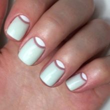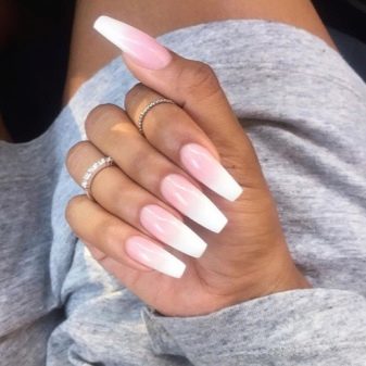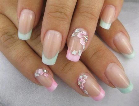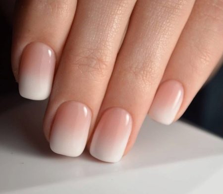 Tento typ designu je v této sezóně neuvěřitelně populární. Její popularita je způsobena tím, že kombinuje několik barev, nikoli naopak, ale v hladké a jemné skladbě. Všechny varianty manikúry ombre vypadají skvěle v jasných světlých barvách. Následující možnosti vypadají luxusně: růžovo-modrý gradient, několik odstínů máty, levandule, nahý gamut, teplé broskvově-meruňkové motivy, studené světle šedé tóny. Stejně jako jiné typy manikúry je sklon perfektně kombinován s různými variacemi dekorů, akcenty.